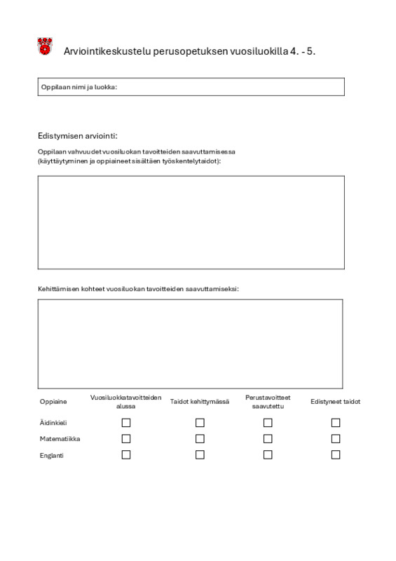 Arviointikeskustelun kirjaukset 4.-5. lk Arviointikeskustelu perusopetuksen vuosiluokilla 4-5.pdf 36.3 kt 0 kommenttia