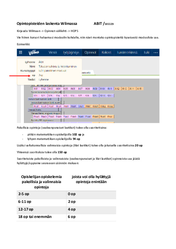 - Wilmassa opinnot välilehdeltä näkyy pakollisten moduulien määrä (pakolliset opintojaksot)