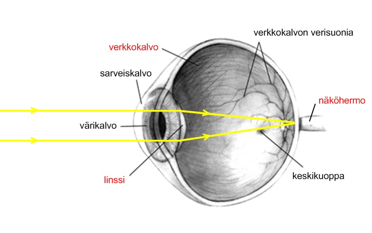Ihmisen silmässä on kupera linssi. Se muodostaa kuvan verkkokalvolle. Muodostunut kuva on verkkokalvolla väärinpäin, mutta aivot tulkitsevat kuvan oikeinpäin olevaksi.