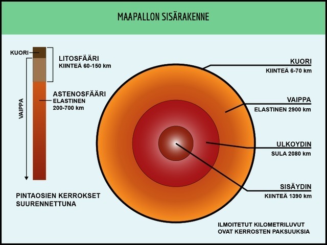 Maapallomme on koostunut kolmesta pääkerroksesta. Nämä ovat kuori, vaippa ja ydin. Heti jalkojemme alla oleva kuori on paksuinta mantereilla ja ohuinta merellä. Mantereilla kuoren paksuus on keskimäärin 30-40 kilometriä ja suurimmillaan se on isojen vuoristojen alla.