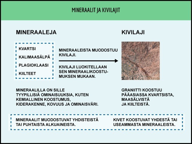 Näin saavat alkunsa kivilajit, joista siis jalkamme alla oleva kallioperä koostuu. Kivilajit muodostuvat puolestaan yhdestä tai useammasta mineraalista. Mineraalit ovat luonnossa esiintyviä alkuaineita tai yhdisteitä. Yleisemmät mineraalit ovat maasälpä KAlSi3O8, kvartsi SiO2, hematiitti Fe2O3, kuparikiisu CuFeS2 ja magnetiitti Fe3O4. Mineraalit voidaan tunnistaa niiden ominaisuuksien perusteella. Näitä ominaisuuksia ovat muun muassa metallinkiilto, magneettisuus, kovuus ja viirun väri.