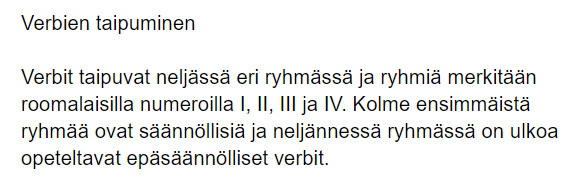6. Tärkeimmät verbit ja niiden taipuminen Jaa Verbien taivutusluokat Harjoittele verbien taivuttamista Kirjaudu sisään lähettääksesi tämän lomakkeen I Kirjoita I- ryhmän verbien preesenstaivutus laatikkoon: lyssna titta träffa spela berätta kosta cykla simma laga mat mat Täydennä I- ryhmän verbeillä oikea verbi oikeassa muodossa laatikkoon. Minä uin Helsingissä. Jag i Helsingfors. Me kuuntelemme musiikki konsertissa. Vi på musik på en konsert. Katsotko sinä jalkapalloa? du på fotboll? Pyöräileekö veljesi kouluun? din bror till skolan? Isoäitini laittaa usein ruokaa. Min mormor ofta mat. Kuinka paljon yksi limsapullo maksaa? Hur mycket en flaska läsk? Isäni kertoo usein vitsejä. Min pappa ofta roliga historier. II Kirjoita II- ryhmän verbien preesenstaivutus laatikkoon: ringa tänka åka köpa resa tycka om om läsa ligga Täydennä II- ryhmän verbeillä oikea verbi oikeassa muodossa laatikkoon. Minä soitan isoäidilleni. Jag till min mormor. Tykkäätkö sinä pizzasta? du om pizza? Ostatko usein vaatteita? du ofta kläder? Mitä hän ajattelee? Vad hon på? Äitini lukee paljon kirjoja. Min mamma massor av böcker. Sijaitseeko Oulu Pohjois-Suomessa? Uleåborg i norra Finland? Me matkustamme Espanjaan. Vi till Spanien. Veljeni ajaa mopolla. Min bror moped. III Kirjoita III- ryhmän verbien preesenstaivutus laatikkoon: bo må tro sy Täydennä III- ryhmän verbeillä oikea verbi oikeassa muodossa laatikkoon. Minä en usko sinua. Jag inte på dig. Hän voi huonosti. Han dåligt. Ompeletko vaatteita? du kläder? Me asumme nyt Hämeenlinnassa. Vi nu i Tavastehus. IV Kirjoita IV- ryhmän verbien preesenstaivutus laatikkoon: vara ha dricka äta komma flyga göra skriva sova säga Täydennä IV- ryhmän verbeillä oikea verbi oikeassa muodossa laatikkoon. Minä olen onnellinen. Jag lycklig. Hän tulee Ruotsista. Han från Tyskland. Me lennämme ensi viikolla Ranskaan. Vi nästä vecka till Frankrike. Mitä teet täällä? Vad du här? Kirjoitatko minulle? du till mig / mej? Onko sinulla koira? du en hund? He syövät usein pizzaa. De öfta pizza. Mitä siskosi juo aamulla? Vad din syster på morgonen? Nukkuuko kissasi hyvin? din katt gott? Hän sanoo aina "Hyvää huomenta!". Han alltid "God morgon!". Kirjaudu sisään lähettääksesi tämän lomakkeen