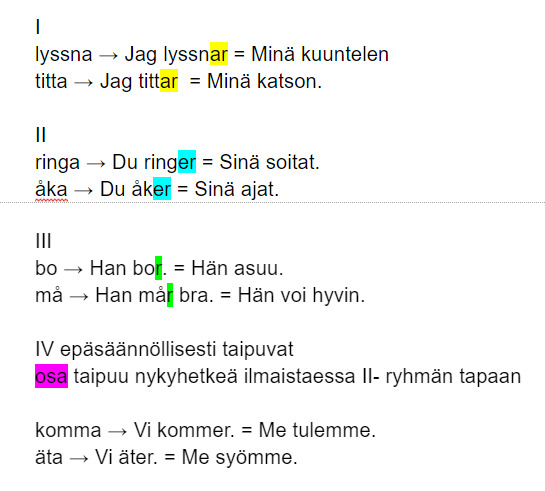 Harjoittele verbien taivuttamista Kirjaudu sisään lähettääksesi tämän lomakkeen I Kirjoita I- ryhmän verbien preesenstaivutus laatikkoon: lyssna titta träffa spela berätta kosta cykla simma laga mat mat Täydennä I- ryhmän verbeillä oikea verbi oikeassa muodossa laatikkoon. Minä uin Helsingissä. Jag i Helsingfors. Me kuuntelemme musiikki konsertissa. Vi på musik på en konsert. Katsotko sinä jalkapalloa? du på fotboll? Pyöräileekö veljesi kouluun? din bror till skolan? Isoäitini laittaa usein ruokaa. Min mormor ofta mat. Kuinka paljon yksi limsapullo maksaa? Hur mycket en flaska läsk? Isäni kertoo usein vitsejä. Min pappa ofta roliga historier. II Kirjoita II- ryhmän verbien preesenstaivutus laatikkoon: ringa tänka åka köpa resa tycka om om läsa ligga Täydennä II- ryhmän verbeillä oikea verbi oikeassa muodossa laatikkoon. Minä soitan isoäidilleni. Jag till min mormor. Tykkäätkö sinä pizzasta? du om pizza? Ostatko usein vaatteita? du ofta kläder? Mitä hän ajattelee? Vad hon på? Äitini lukee paljon kirjoja. Min mamma massor av böcker. Sijaitseeko Oulu Pohjois-Suomessa? Uleåborg i norra Finland? Me matkustamme Espanjaan. Vi till Spanien. Veljeni ajaa mopolla. Min bror moped. III Kirjoita III- ryhmän verbien preesenstaivutus laatikkoon: bo må tro sy Täydennä III- ryhmän verbeillä oikea verbi oikeassa muodossa laatikkoon. Minä en usko sinua. Jag inte på dig. Hän voi huonosti. Han dåligt. Ompeletko vaatteita? du kläder? Me asumme nyt Hämeenlinnassa. Vi nu i Tavastehus. IV Kirjoita IV- ryhmän verbien preesenstaivutus laatikkoon: vara ha dricka äta komma flyga göra skriva sova säga Täydennä IV- ryhmän verbeillä oikea verbi oikeassa muodossa laatikkoon. Minä olen onnellinen. Jag lycklig. Hän tulee Ruotsista. Han från Tyskland. Me lennämme ensi viikolla Ranskaan. Vi nästä vecka till Frankrike. Mitä teet täällä? Vad du här? Kirjoitatko minulle? du till mig / mej? Onko sinulla koira? du en hund? He syövät usein pizzaa. De öfta pizza. Mitä siskosi juo aamulla? Vad din syster på morgonen? Nukkuuko kissasi hyvin? din katt gott? Hän sanoo aina "Hyvää huomenta!". Han alltid "God morgon!". Kirjaudu sisään lähettääksesi tämän lomakkeen
