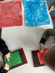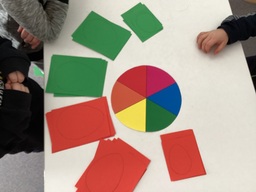 Viime viikkoisten musiikkimaalausten tuotokset päätyvät tulevaan askarteluprojektiimme. Projektissa tutustumme väriympyrään, vastaväreihin sekä värien sekoittamiseen. Projektimme alkoi tutkimalla, mikä on oman musiikkimaalauksen vastaväri? Oikean värin löydyttyä aloitimme pääsiäismunien teon oman työn vastavärillä joko pistellen tai saksilla leikkaamalla.