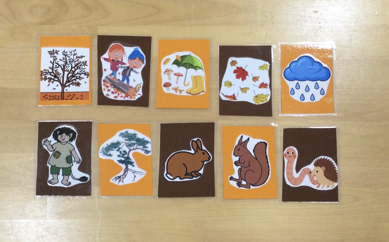 Tämän kuvan tekstivastine: Pahvisia syyslaulujen kuvia.