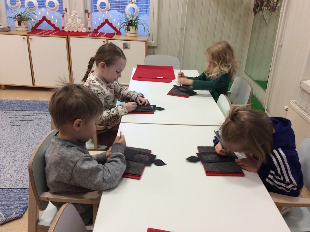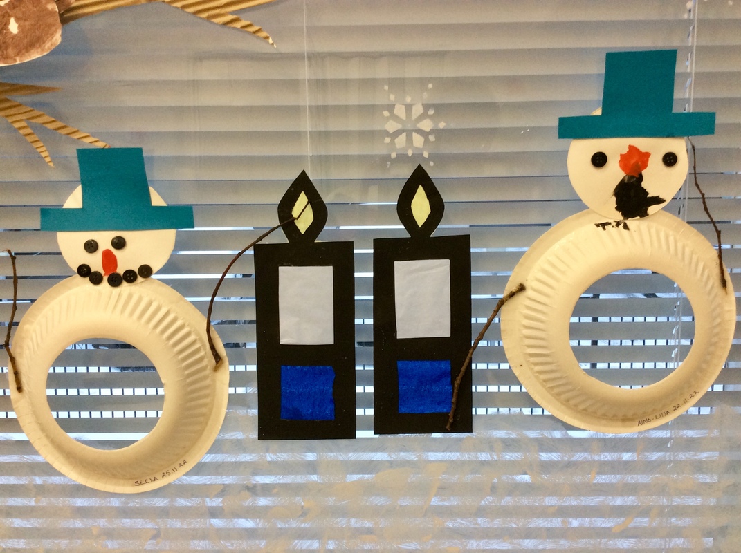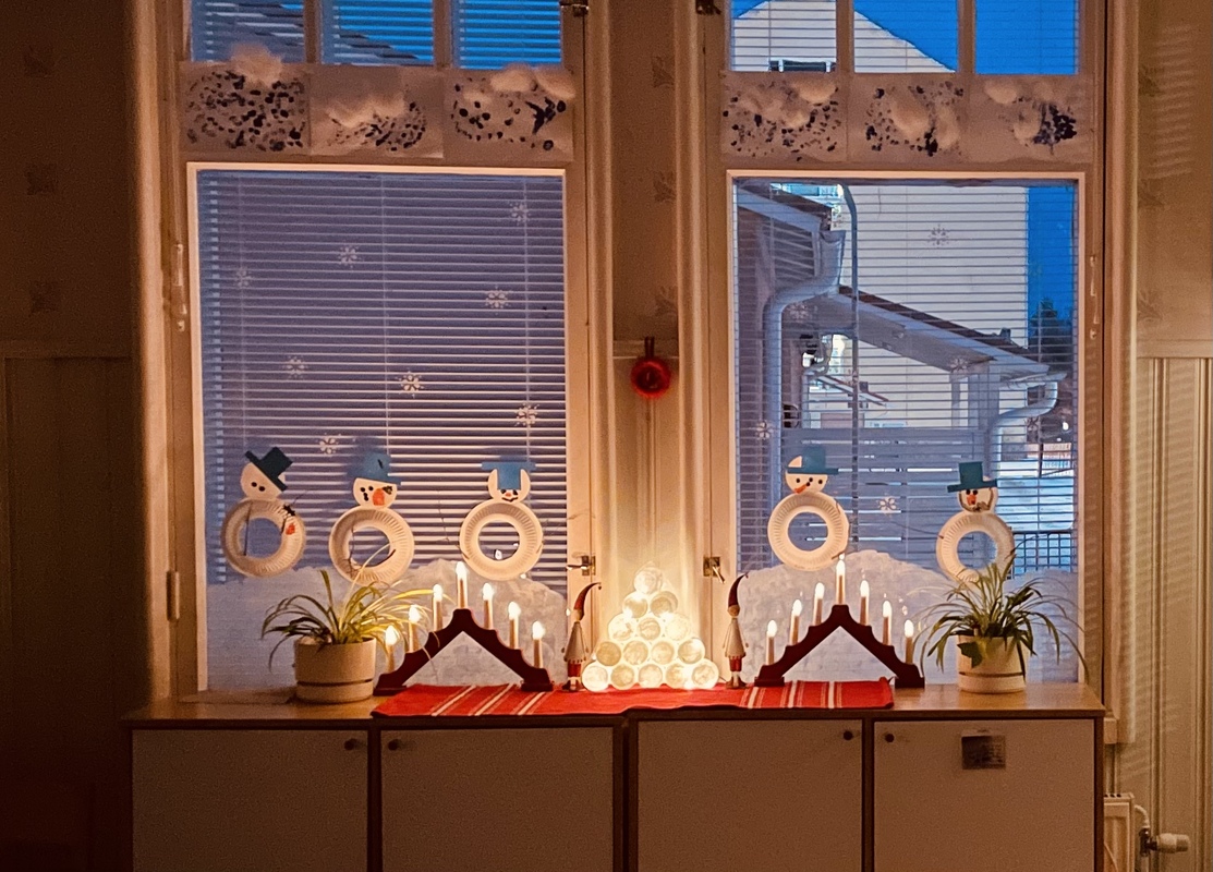 Lumiukkojen askartelu on tarkkaa puuhaa 😁 Ja hienoja lumiukkoja valmistui ketjuun ikkunaan.