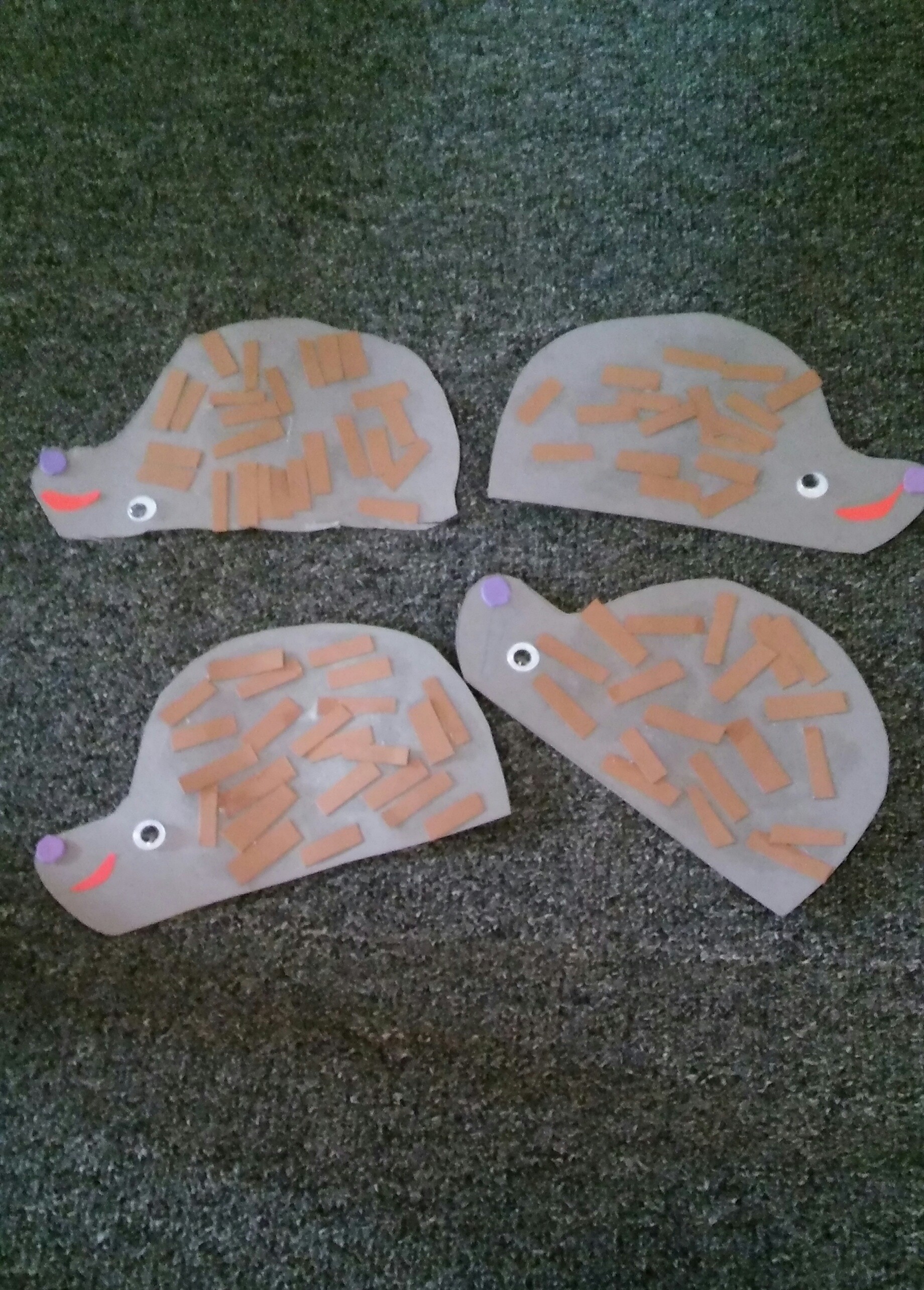 Tänään olimme aamulla sisällä, kun ulkona näytti niin sateiselta ja askartelimme siilit.