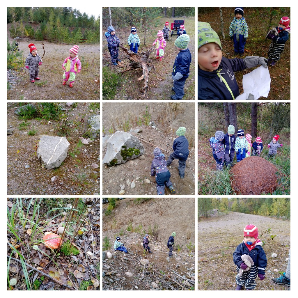 Metsäretkellä Tiian ryhmän kanssa.Eino piirsi kartan meille mukaan, johon oli piirretty sieni, laho puu, iso kivi ja muurahaispesä ja ne meidän piti etsiä.Kaikki löydettiin ☺