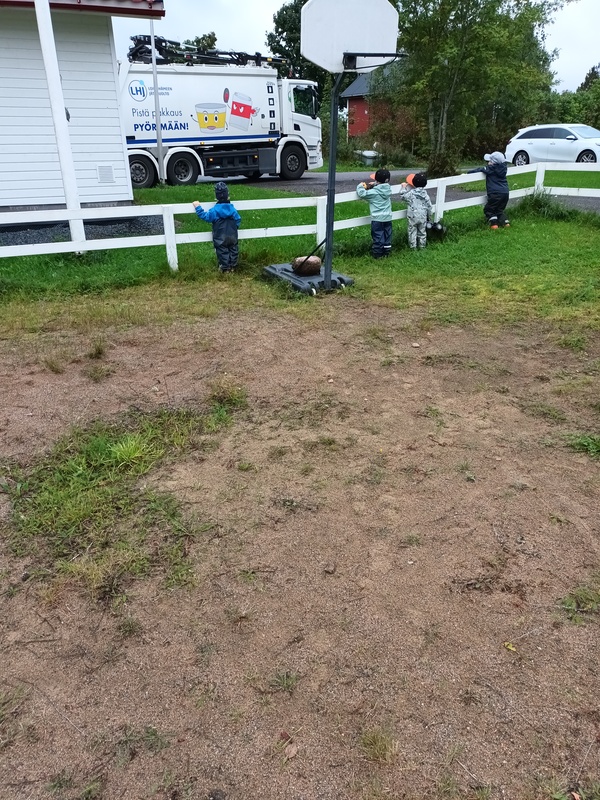 Me viedään joka päivä aina yhdessä roskia roskikseen, niin sit on jännä juttu, kun roskisauto hakee ne.