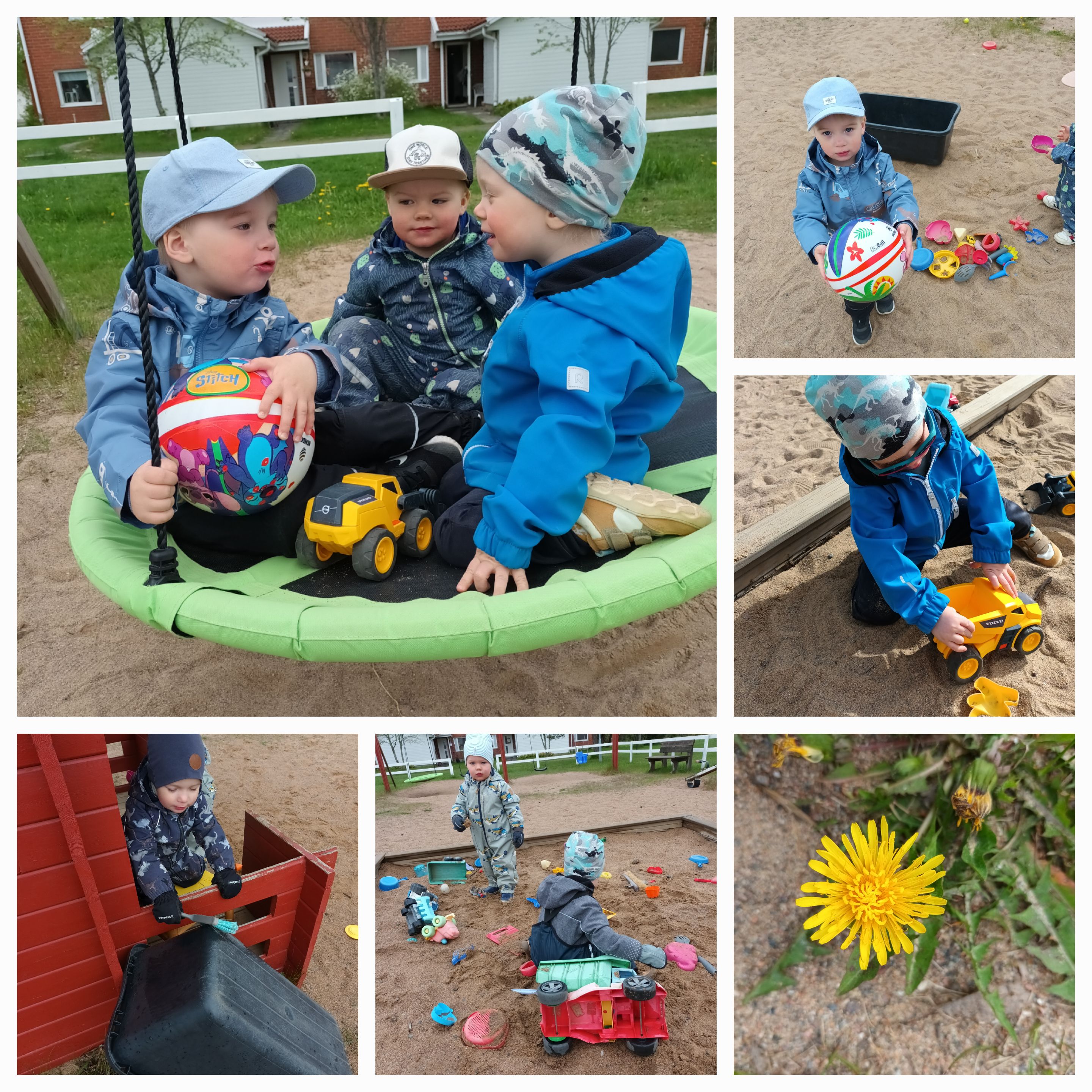 Toukokuussa on keinuttu, siivottu leikkimökkiä, leikitty hiekkaleikkejä ja ajeltu uudella Volvo autolla, hyvin kulkee.