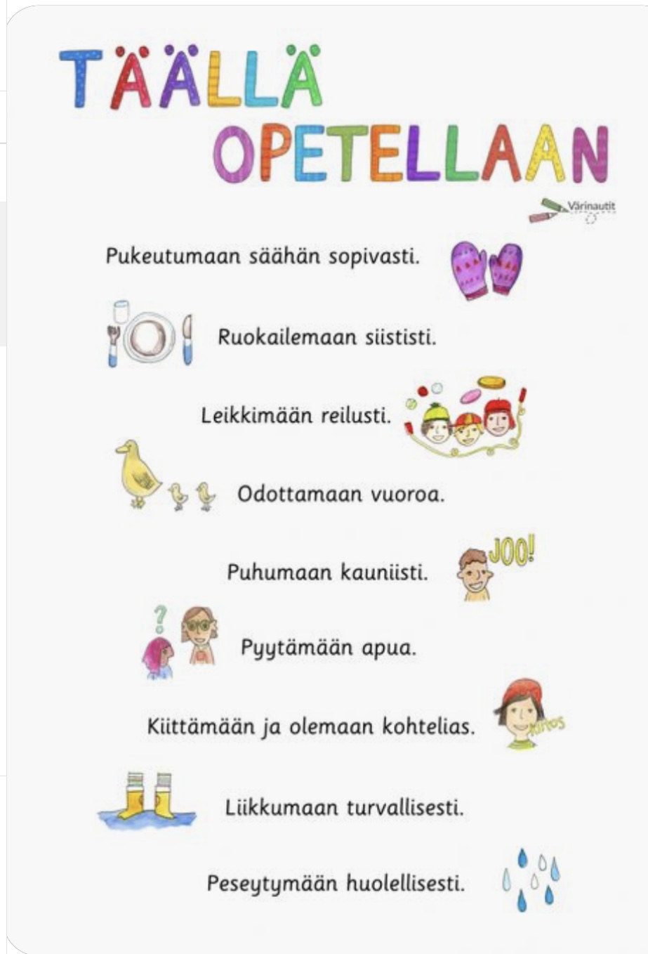 Tarjoan lämmintä ja turvallista läsnäoloa, kehuja, kiitosta ja kannustusta sekä avointa ja rehellistä vuorovaikutusta, kasvatuskumppanuutta ja yhteistyötä.