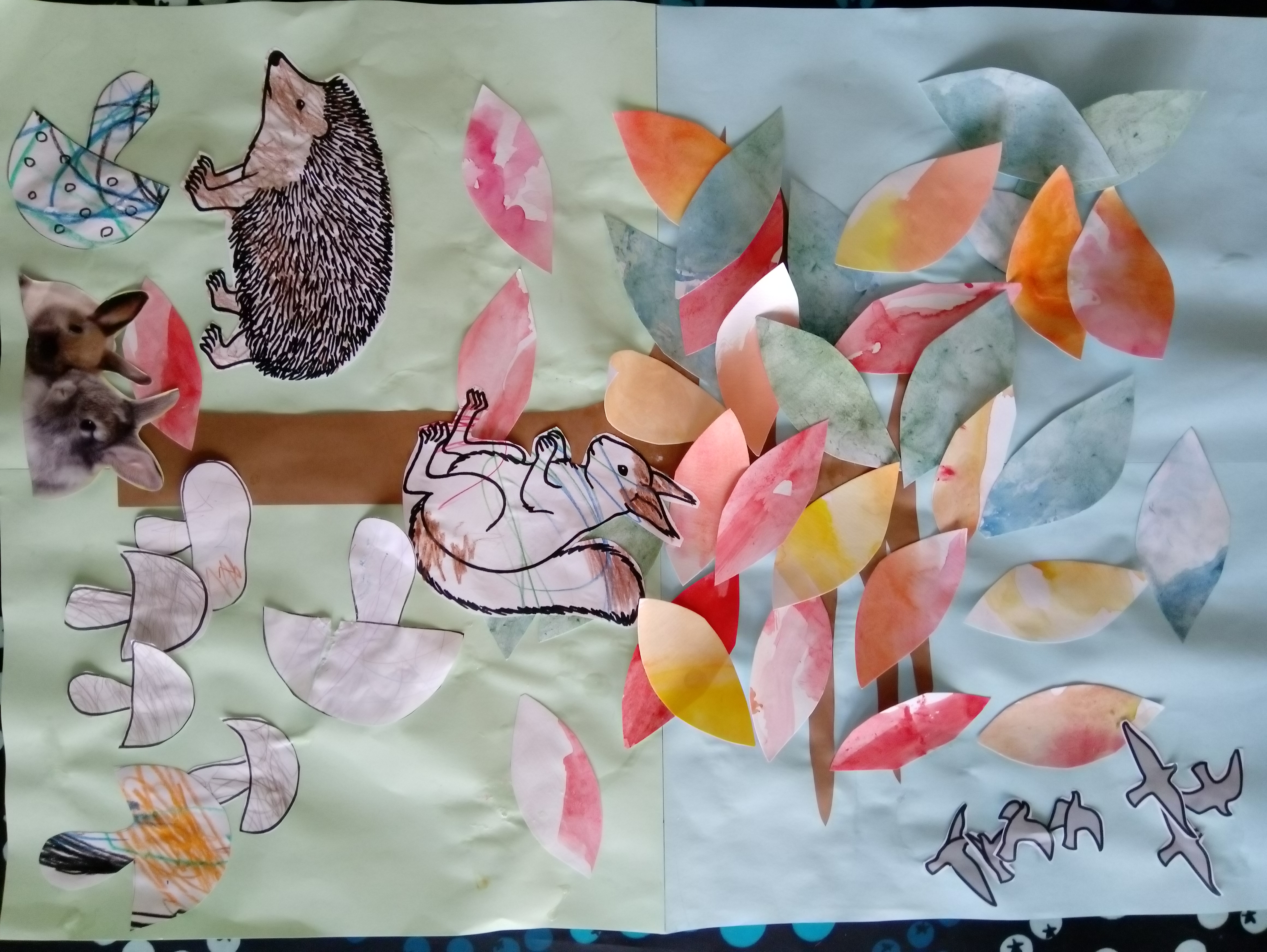 Syyskuulla askarreltiin yhdessä lastenhuoneeseen syksyinen taulu, muisteltiin mitä on ulkoillessa nähty ja piirrettiin, maalattiin ja liimattiin niitä; muuttolintuparvia, tammenterhoja kätkeviä oravia, siili menossa talvipesäänsä, pupuja ja paljon sieniä ja kirjavia lehtiä puissa