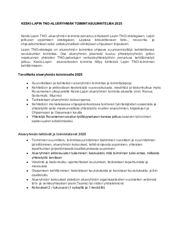 Toimintasuunnitelma 2025 Keski-Lappi TNO alueryhmä_päivitys 3.2.-25.pdf Jaa Sulje Tämän tiedoston tekstivastine: (tyhjä tekstivastine) Toimintasuunnitelma 2025 Keski-Lappi TNO alueryhmä_päivitys 3.2.-25.pdf 221.2 kt