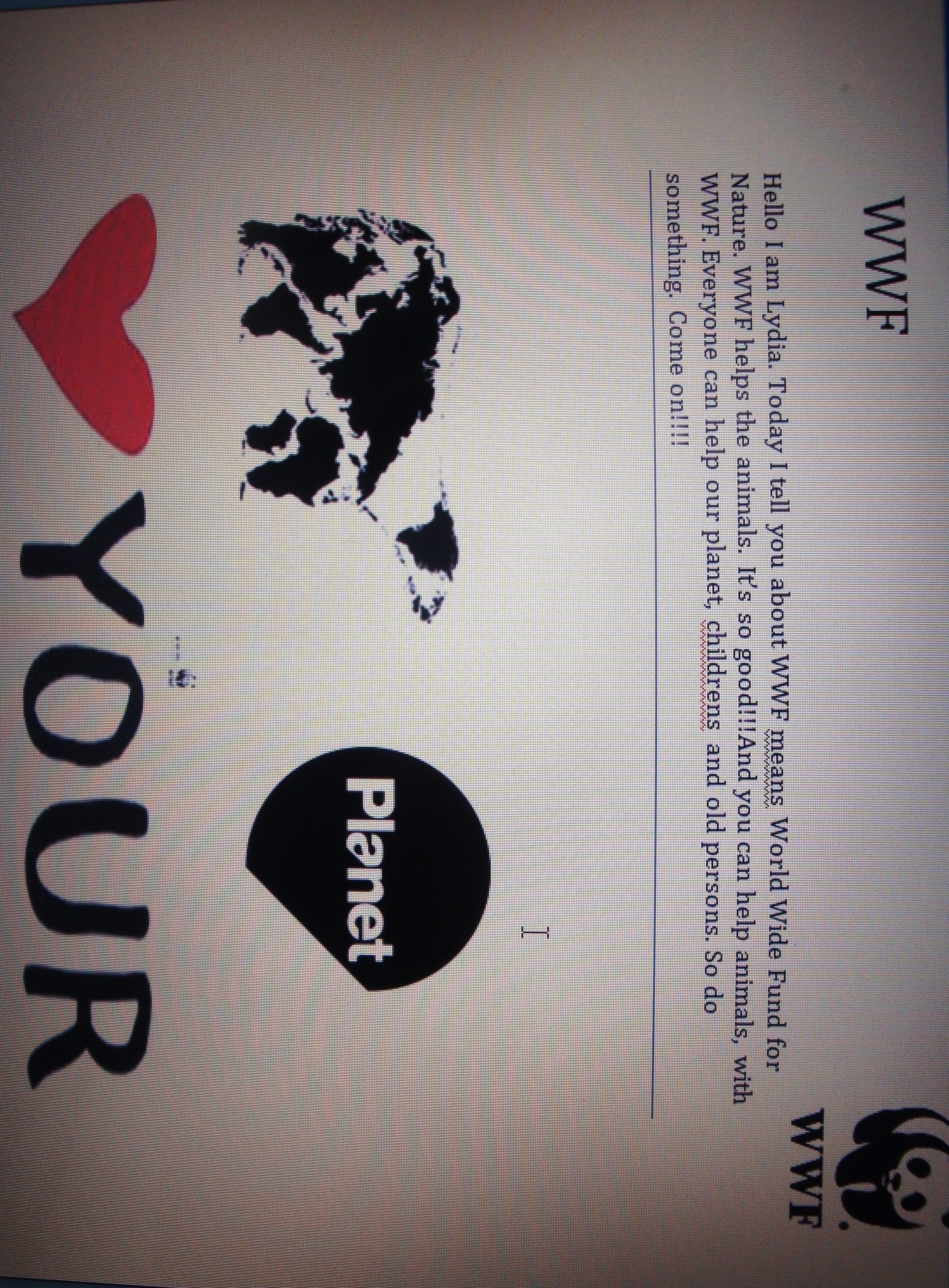 Lydia ,10 yrs old, wrote a message about WWF Jaa Sulje Tämän kuvan tekstivastine: (tyhjä tekstivastine) DSC09845.JPG 3.3 Mt