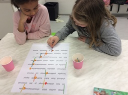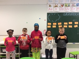 Puuttuva kertoja. Laskuista puuttui laskun kertoja. Puuttuvia lukuja haettiin käytävän hyppyruudukon takaa ja palattiin luokkaan laittamaan lukuja paikoilleen.
