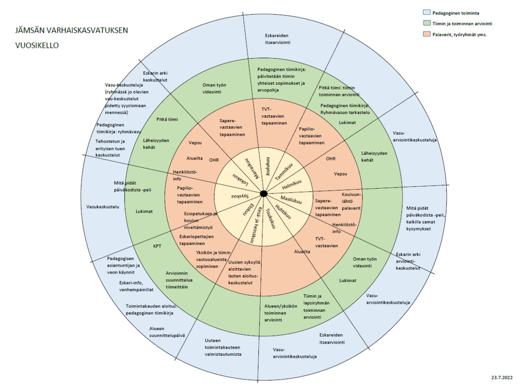 Toimintakulttuuria arvioidaan ja kehitetään tiimi- ja yksikköpalavereissa, vasukahviloissa ja VEPSU-työryhmässä, perhepäivähoidon työkokouksissa. Lisäksi kehittämistyötä tehdään koulutuksellisissa työilloissa, vuosittain yksiköiden suunnittelupäivillä sekä henkilöstön kehityskeskusteluissa. Varhaiskasvatuksen arviointi- ja kehittämistyön tukena varhaiskasvatuksessa ja esiopetuksessa on käytössä varhaiskasvatuksen vuosikello, johon on kalenteroitu varhaiskasvatustyön kannalta keskeisiä suunnittelun ja arvioinnin palavereja ja tehtäviä. Vuosikellon tehtävänä on tukea varhaiskasvatuksen suunnittelu-, arviointi-, ja kehittämistyötä ja luoda yhtenäisiä rakenteita arviointiin sekä selkiyttää arviointityön kokonaisuutta. Vuosikelloon on sisällytetty pedagogisen toiminnan arviointia, tiimin ja työyhteisön arviointia sekä varhaiskasvatuksen yhteisten painotusalueiden ja toiminnan arviointia.