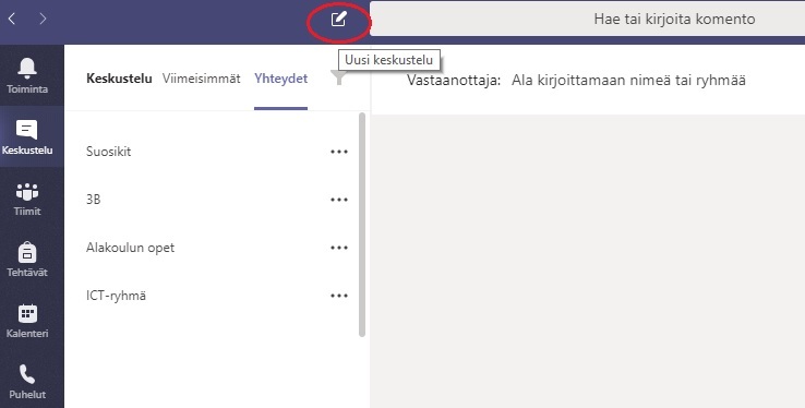 Viestin lähettäminen Vasemman reunan valikossa painike Keskustelu (chat) Valitse: "Uusi keskustelu" Hae henkilö, jolle haluat lähettää viestisi. Kun kirjoitat Vastaanottaja -kenttään nimen alkua, avautuu tarjolle vaihtoehtoja. Kirjoita viestisi.