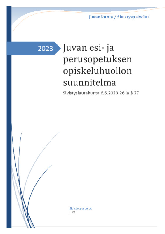 Opiskeluhuollon suunnitelma 2023- Jaa Sulje Tämän tiedoston tekstivastine: (tyhjä tekstivastine) Opiskeluhuollon suunnitelma Juvan esi- ja perusopetus 2023.pdf 1.1 Mt
