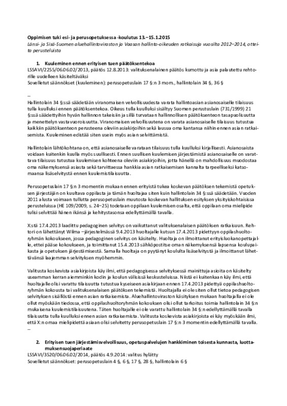 Materiaalit Jaa Inhimillisten toimintamahdollisuuksien lähestymistapa, Okkolin & Koskela Tekijä: Hanna-Kaisa Pekkarinen Okkolin_Koskela_nelikentta_lyhyt_taustoitus.pptx 62.9 kt 0 kommenttia Erityiskasvatuslehti 1/2019_Nina Lahtinen_ Ajankohtaista lastensuojelusta_Koulun ja sosiaalitoimen yhteistyö Tekijä: Merja Koivisto Lahtinen_LS juttu.docx 16.2 kt Kuulemistilaisuuden perusasiat tiivistetysti Tekijä: Merja Koivisto Perusasiat.docx 61 kt Lomakepohja 2_ Muistio kuulemistilaisuudesta Tekijä: Merja Koivisto Muistio kuulemistilaisuudesta valmis.docx 52 kt Lomakepohja 1_Kutsu kuulemistilaisuuteen Tekijä: Merja Koivisto Kutsu kuulemistilaisuuteen valmis.docx 54.9 kt TTJ II, Mikkeli ja Tampere_Valteri Tekijä: Hanna-Kaisa Pekkarinen TTJ II_Mikkeli_ja_Tampere_16.-17.1.2019_Valteri.pdf 1.9 Mt 4 kommenttia TTJ II, Vaasa_Valteri Tekijä: Jukka Vetoniemi TTJ II,Vaasa150119a.pdf 1.1 Mt 1 kommenttia Opetuksellisen tuen säännöksiä Tampere 170119, AVI Esko Lukkarinen Tekijä: Hanna-Kaisa Pekkarinen Tampere 170119.pptx 158.1 kt 0 kommenttia Tukea tuen järjestäjille -koulutus 15-160119, AVI Kreeta Pölönen Tekijä: Jukka Vetoniemi Tukea tuen järjestäjille -koulutus 15-160119.pdf 123.5 kt 0 kommenttia oppimisen_tuki_oikeuskäytäntö.pdf Tekijä: Jukka Vetoniemi oppimisen_tuki_oikeuskäytäntö.pdf 785.1 kt 0 kommenttia