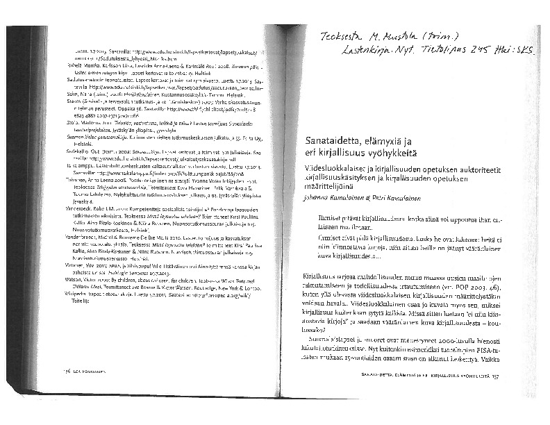Kainulainen, J. & Kainulainen, P. 2014. Sanataidetta, elämyxiä ja eri kirjallisuus vyöhykkeitä. Viidesluokkalaiset ja kirjallisuuden opetuksen auktoriteetit kirjallisuuskäsityksen ja kirjallisuuden opetuksen määrittelijöinä. Teoksessa M. Mustola (toim.) Lastenkirja. Nyt. Tietolipas 245. Helsinki: SKS, 137–170. Skannattuna tässä kansiossa.