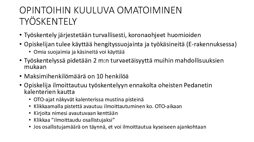Osa demoista etäopetuksena, osa lähiopetuksena. Lähiopetuksessa ryhmä jaetaan eri tiloihin (E-rakennus) tai opetus toteutetaan puolikkaalle ryhmälle kerrallaan (X-rakennus)