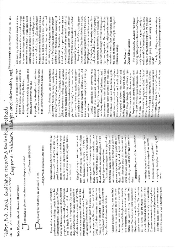 Patton Fieldwork strategies and observation methods A.pdf Jaa Sulje Tekijä: Ulla Maija Valleala Tämän tiedoston tekstivastine: (tyhjä tekstivastine) Patton Fieldwork strategies and observation methods A.pdf 10.9 Mt