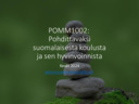 | Vko 2 | to 11.1. klo 8.15 - 10.00 (huom. aika): Info POM-opinnoista ja POM-johdannosta sekä PROpe-työskentelystä (Rissanen & Kainulainen) Luento: Oppiaineiden politiikkaa & filosofiaa (Rautiainen) |