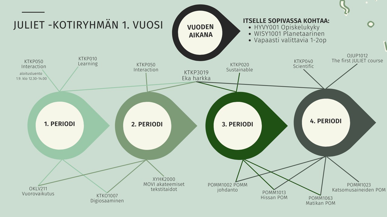 Huomioithan, että tällä sivulla on vain opintoihin liittyvien yleisinfojen materiaaleja. Opintojaksojen mahdolliset luentotallenteet ja muut materiaalit löytyvät kurssien omista oppimisympäristöistä.