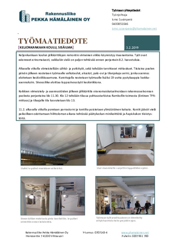 Työmaatiedote viikko 5 Jaa Sulje Tekijä: Tiina Hannula Tämän tiedoston tekstivastine: (tyhjä tekstivastine) työmaatiedote KKK 3.2.2019.pdf 273.9 kt Kommentit Kirjaudu sisään lisätäksesi tähän kommentin