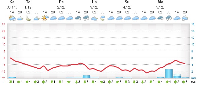Sää Jaa viikko 34 Koonnut: Elina pajanen 10 päivän ennuste Tänään Melko pilvistä ja poutaa Ylin: +16° Alin: +11° 3 m/s Tuntiennuste Huomenna Pilvistä, ajoittaista sadetta Ylin: +18° Alin: +10° 4 m/s Tuntiennuste Pe 26.8. Puolipilvistä ja poutaa Ylin: +18° Alin: +10° 2 m/s Tuntiennuste La 27.8. Puolipilvistä, mahdollisesti vähäistä sadetta Ylin: +16° Alin: +11° 6 m/s Tuntiennuste Su 28.8. Puolipilvistä ja poutaa Ylin: +16° Alin: +9° Viikko 38 Koonnut: Elina Pajanen Jyväskylä 10 päivän ennuste Tänään Pilvistä ja poutaa Ylin: +12° Alin: +5° 2 m/s Tuntiennuste Huomenna Pilvistä ja poutaa Ylin: +11° Alin: +3° 3 m/s Tuntiennuste Pe 23.9. Puolipilvistä ja poutaa Ylin: +10° Alin: +4° 5 m/s Tuntiennuste La 24.9. Melko pilvistä, mahdollisesti vähäistä sadetta Ylin: +11° Alin: +5° 3 m/s Tuntiennuste Su 25.9. Melko pilvistä ja poutaa Ylin: +13° Alin: +4° 1 m/s Tuntiennuste Ma 26.9. Melko pilvistä ja poutaa Ylin: +15° Alin: +6° 2 m/s Tuntiennuste Ti 27.9. Pilvistä ja poutaa Ylin: +13° Alin: +6° 4 m/s Tuntiennuste Ke 28.9. Pilvistä, mahdollisesti vähäistä sadetta Ylin: +12° Alin: +6° 5 m/s Tuntiennuste To 29.9. Melko pilvistä, mahdollisesti vähäistä sadetta Ylin: +11° Alin: +5° 4 m/s Tuntiennuste Pe 30.9. Melko pilvistä, mahdollisesti vähäistä sadetta Ylin: +11° Alin: +4° 4 m/s Tuntiennuste Vko 39 Koonnut: Elina Pajanen Jyväskylä 10 päivän ennuste Tänään Pilvistä ja poutaa Ylin: +13° Alin: +9° 5 m/s Tuntiennuste Huomenna Puolipilvistä, mahdollisesti vähäistä sadetta Ylin: +13° Alin: +9° 6 m/s Tuntiennuste Pe 30.9. Puolipilvistä, mahdollisesti vähäistä sadetta Ylin: +12° Alin: +8° 6 m/s Tuntiennuste La 1.10. Puolipilvistä, ajoittain sadetta Ylin: +12° Alin: +6° 5 m/s Tuntiennuste Su 2.10. Melkein selkeää ja poutaa Ylin: +13° Alin: +5° 4 m/s Tuntiennuste Ma 3.10. Puolipilvistä ja poutaa Ylin: +12° Alin: +5° 3 m/s Tuntiennuste Ti 4.10. Selkeää ja poutaa Ylin: +9° Alin: +3° 4 m/s Tuntiennuste Ke 5.10. Melko pilvistä ja poutaa Ylin: +10° Alin: +3° 3 m/s Tuntiennuste To 6.10. Melko pilvistä ja poutaa Ylin: +10° Alin: +4° 3 m/s Tuntiennuste Pe 7.10. Melko pilvistä ja poutaa Ylin: +10° Alin: +4° 3 m/s Tuntiennuste Vko 40 Vko 40 Koonnut: Elina Pajanen Jyväskylä Ennustekartta, Suomi Täsmäsää™ Vko 41 Viikon 41 sää Koonnut: Elina Pajanen Jyväskylä Ennustekartta, Suomi Täsmäsää™ Vko 43 Vko: 43 sää Koonnut: Elina Pajanen Jyväskylä Ennustekartta, Suomi Täsmäsää™ Vko 45 Vko 45 Koonnut: Elina Pajanen Jyväskylä Vko 46 Vko 46 sää koonnut: Elina Pajanen Jyväskylä Ennustekartta, Suomi Täsmäsää™ Vko 48 Koonnut: Elina Pajanen Jyväskylä Ennustekartta, Suomi Täsmäsää™ Viimeisimmät havainnot Vko 49 Koonnut: Elina pajanen Jyväskylä Ennustekartta, Suomi Täsmäsää™