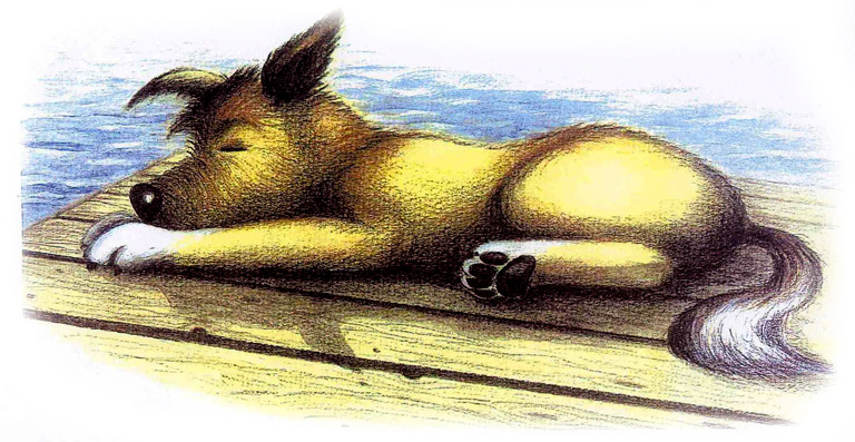 Laiturilla nukkuu karvainen koira. Koiran nimi on Seppo.