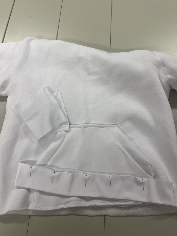 Ompelin taskun kiinni huppariin. Leikkasin resorit ja ompelin hihansuuresorit. Silitin helmaresorin ja neulasin sen