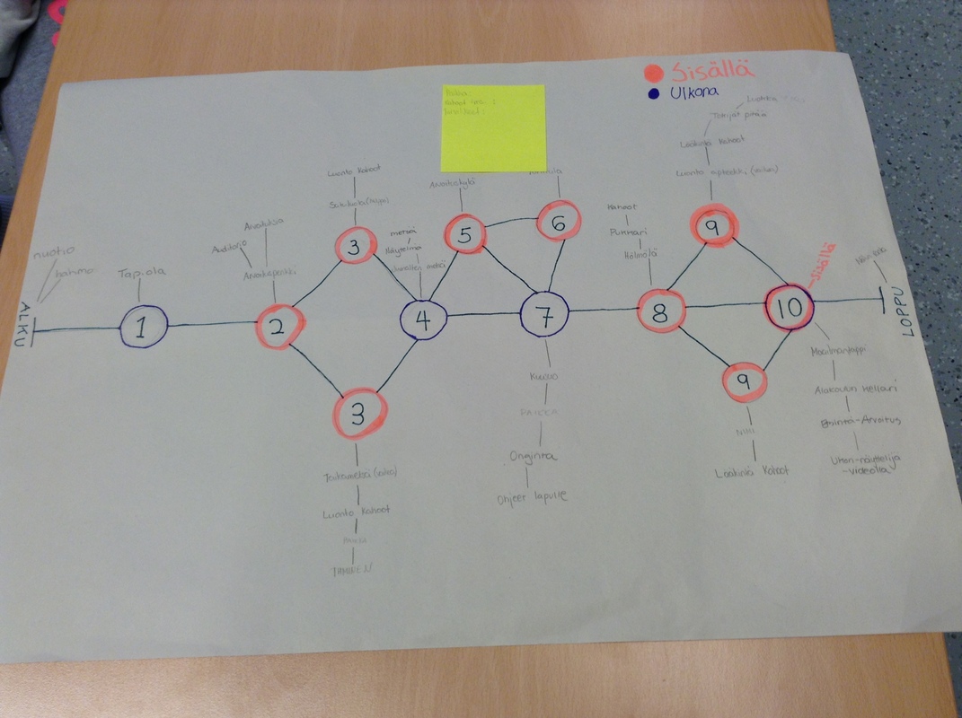 Kaksi ekaa Mono-päivää takana. Loppupalaverissa käytiin läpi, mitä valmiina ja mitä vielä puuttuu. Alkutilanne on kuvattu Aurasmaa apuna käyttäen. Rasti yksi Tapion kanssa tekeillä. Kakkosrasti osittain valmiina. Kolmosrasti kortit Ja Kahoot jo tehty. QR-koodit puuttuu. Nelosrastin näytelmä suunniteltu ja kuvaus seuraavana monona. Vitosrasti arvoituksineen tehty. Kutosrasti melkein valmis: pienille ja isoille oma ohjelma. Seitsemäs rasti done. Kasirasti tekemättä. Ysi rasti lähes valmis. Kymppi puuttuu kokonaan. Lopetus tekemättä. Tarinan peilejä tehty seitsemän ja työstö jatkuu seuraavassa monossa.