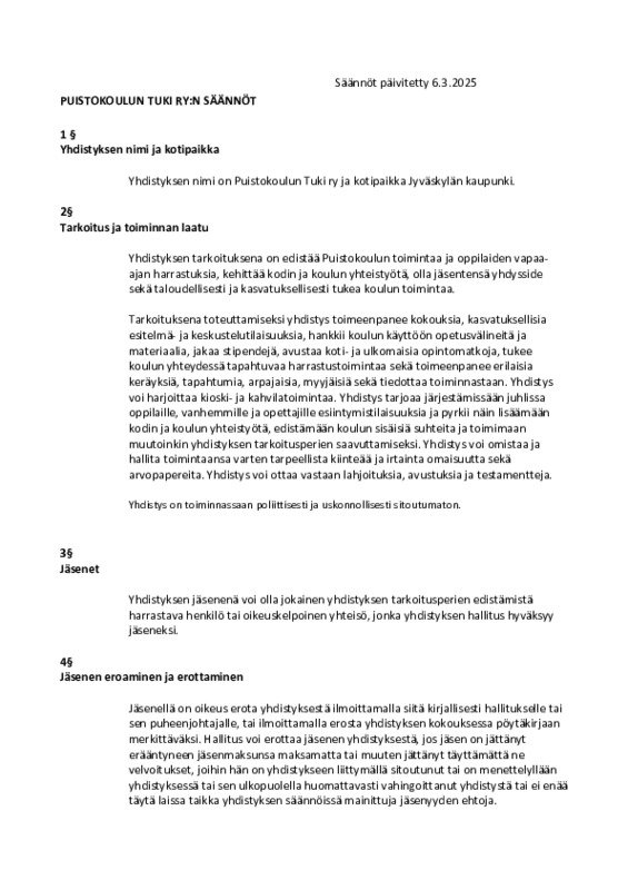 Puistokoulun Tuki ry:n säännöt