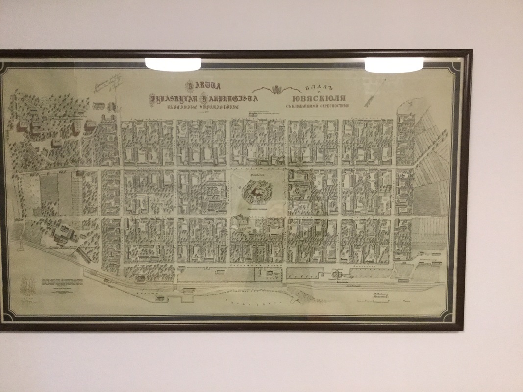 Korttelipiirros vanhasta Jyväskylästä Jyväskylän kaupunki lahjoitti tämän taulun Puistokoululle 100-vuotislahjaksi.