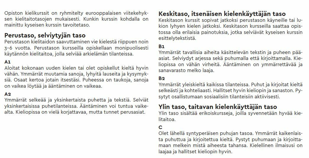 Suomen kielen kurssien eteneminen tasolta toiselle / Finnish language courses from one level to another