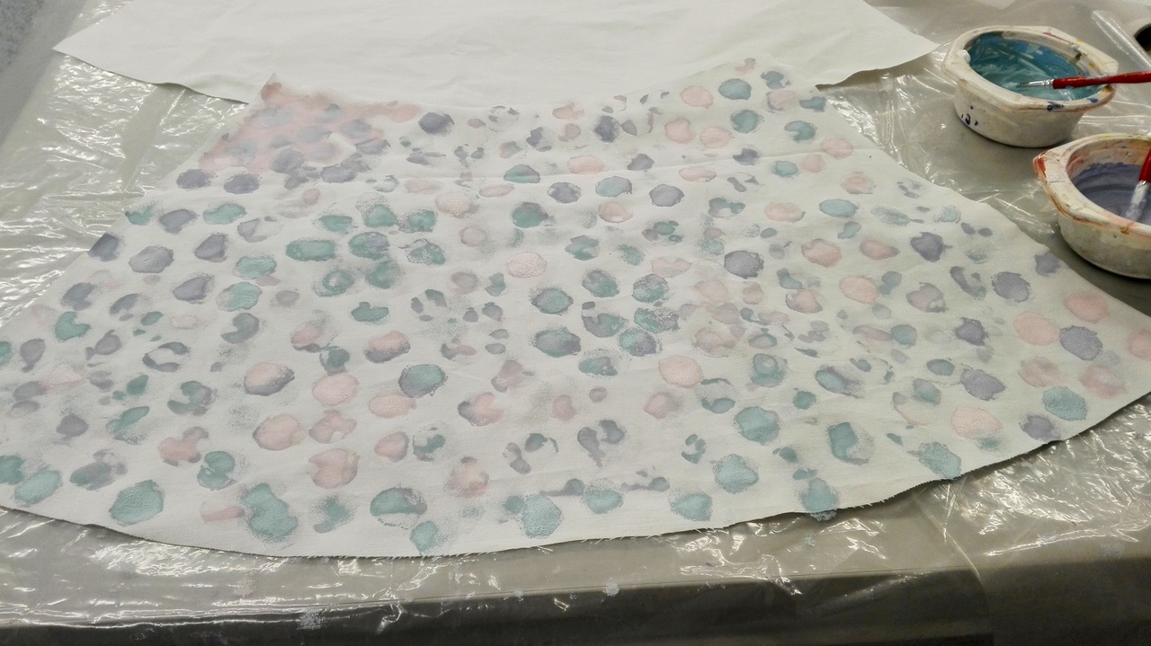 Töpöttelin tommosia "palloja" kankaalle noita kolmea väriä käyttäen.