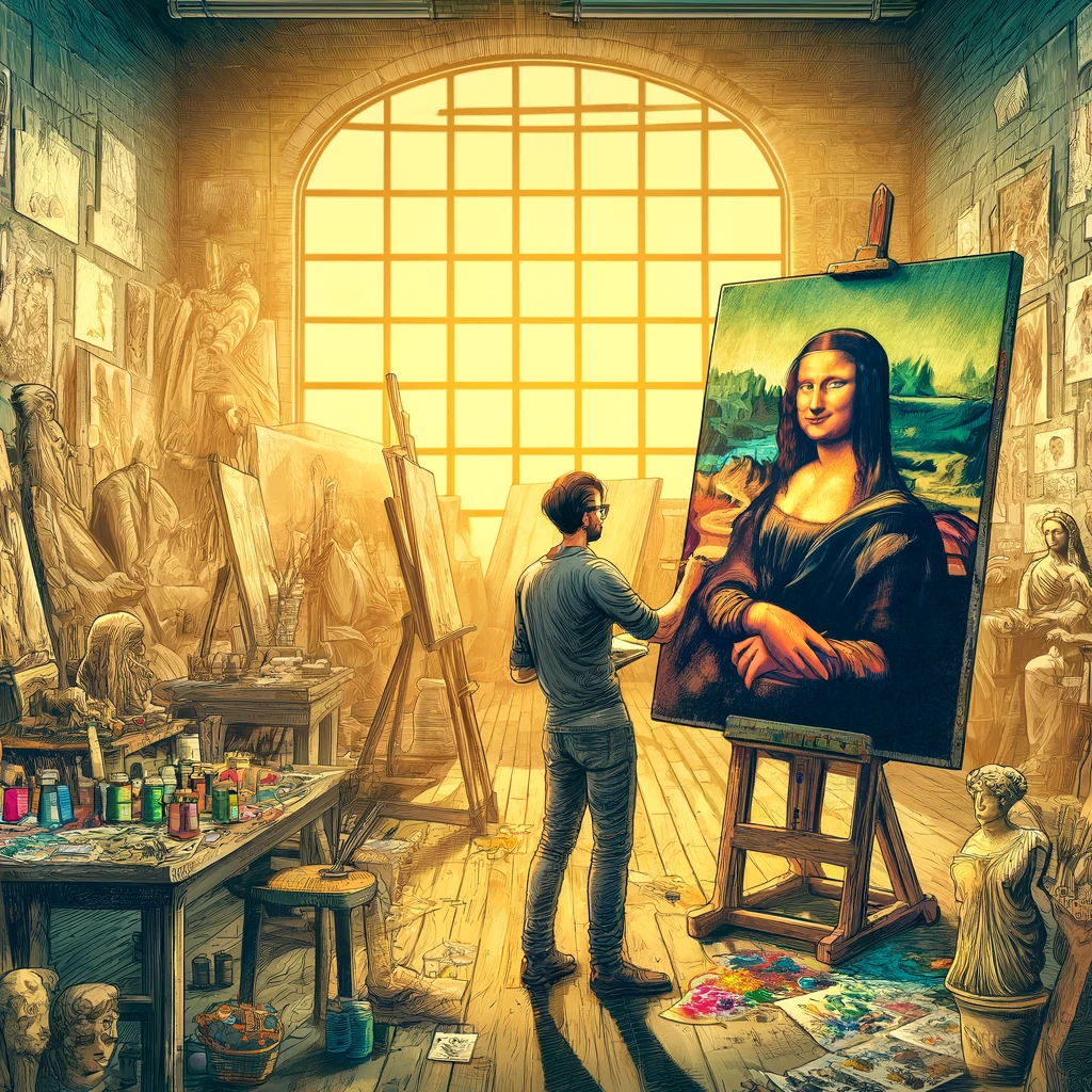 Jakaminen Sulje DALL·E 2024-04-08 16.00.17 - An artist in the midst of painting the Mona Lisa, standing before a large canvas in a sunlit, spacious studio filled with art supplies, sketches, and .png Pysyvä osoite https://peda.net/id/e07be416a8c Pysyvä tiedoston latausosoite https://peda.net/id/e07be416a8c:file/download/768dac0fdf592a7e7535d8c91c39e4c35ce90489/DALL%C2%B7E%202024-04-08%2016.00.17%20-%20An%20artist%20in%20the%20midst%20of%20painting%20the%20Mona%20Lisa%2C%20standing%20before%20a%20large%20canvas%20in%20a%20sunlit%2C%20spacious%20studio%20filled%20with%20art%20supplies%2C%20sketches%2C%20and%20.png Jakaminen muihin palveluihin Share this page to Facebook QR-koodi