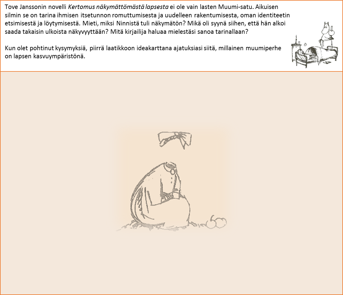 Tove Janssonin novelli kertomus Näkymättömästä lapsesta ei ole vain lasten Muumi-satu. Aikuisen silmin se on tarina ihmisen itsetunnon romuttumisesta ja uudelleen rakentumisesta, oman identiteetin etsimisestä ja löytymisestä. Mieti, miksi Ninnistä tuli näkymätön? Mikä oli syynä siihen, että hän alkoi saada takaisin ulkoista näkyvyyttään? Mitä kirjailija haluaa mielestäsi sanoa tarinallaan?