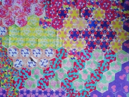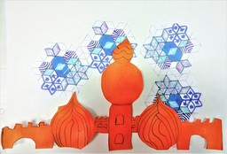 Palatsin mosaiikkiseinää kokosimme pienistä kuusikulmioista. Kun kuusikulmiot oli väritetty, kopioin niitä kerralla useamman jokaiselle. Näin pääsimme kokeilemaan pinnan jatkuvuutta. Kauniisti värjäytyneitä palatsinkappaleita oli jäänyt yli myös Aladdinin taikalamppu -työstä.