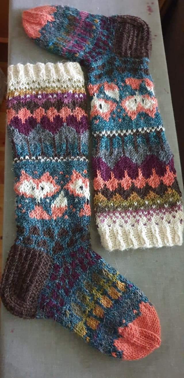 Tämän kuvan tekstivastine: Kettuaiheiset kirjoneulesukat