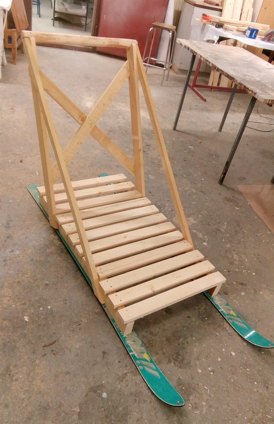 Tämän kuvan tekstivastine: Puusta valmistettu vesikelkka