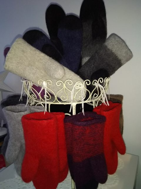 Huovutetut kintaat Jaa Sulje Tämän kuvan tekstivastine: Monta paria erivärisiä huovutettuja villakintaita. Kintaat 39.3 kt