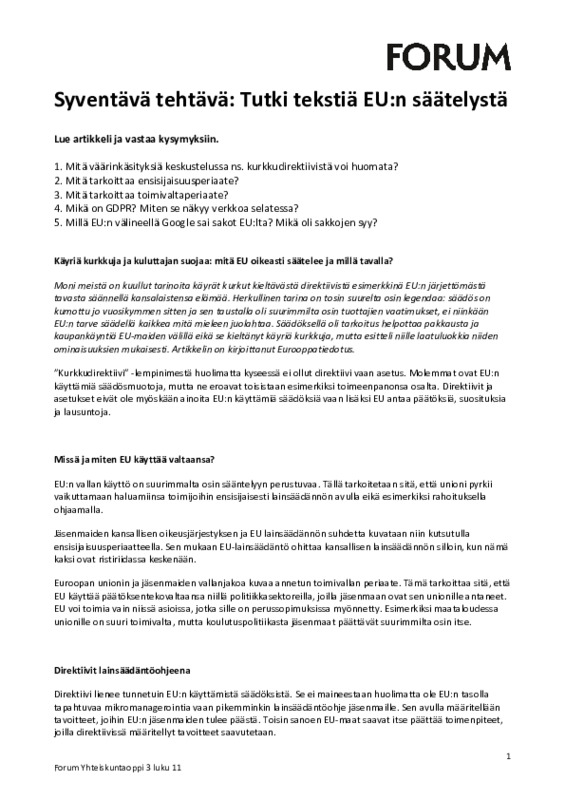 IV Unionin päätöksenteko ja talous Jaa Palautukset Palauta kuva tai muu tiedosto Palauta merkintä Palauta linkki Palauta äänitallenne Sinulla ei ole tarvittavia oikeuksia lähettää mitään. Video ja väittämät https://yle.fi/aihe/a/20-10002363 Ovatko väitteet oikein vai väärin? Korjaa väärät väitteet. a) EU kielsi muovipillit EU:n perustuslailla. b) Direktiivi tulee voimaan sellaisenaan maiden lainsäädännössä. c) EU-asetus on EU-lain alapuolella ja tarkentaa sitä, kuten asetus ja laki Suomen laissa. d) Kaikki EU:n lakialoitteet käsitellään Suomen eduskunnassa. e) EU:n kansalaisaloite on yleinen tapa säätää EU-lakeja. Tehtävä: Teksti EU-säätelystä EU säätely.pdf 152 kt 0 kommenttia
