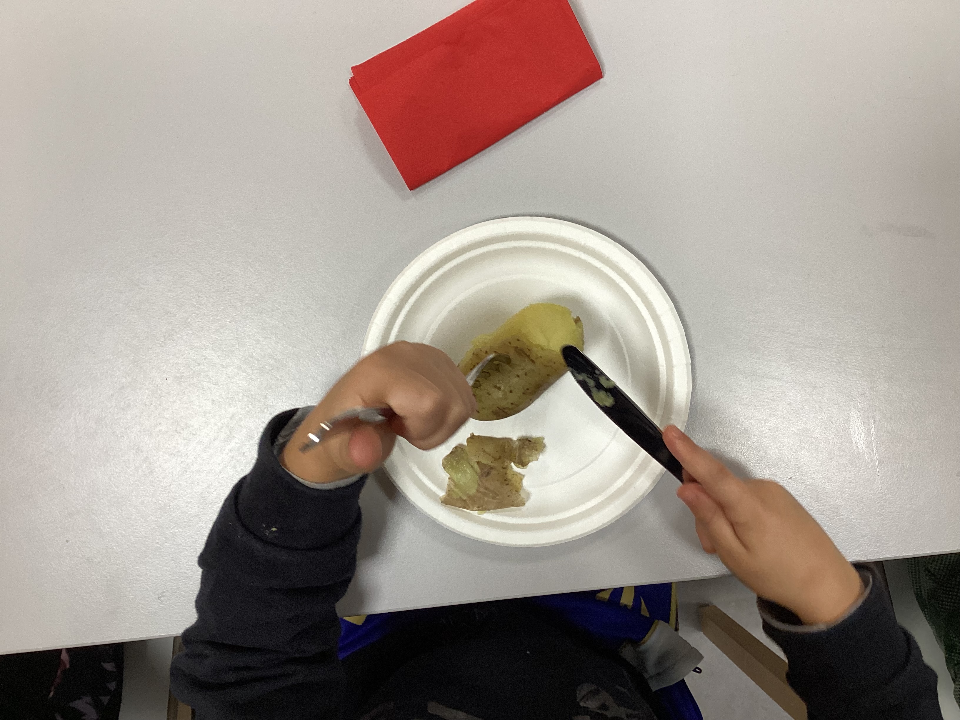 Harjoittelimme veitsellä ja haarukalla syömistä, sekä perunan kuorimista