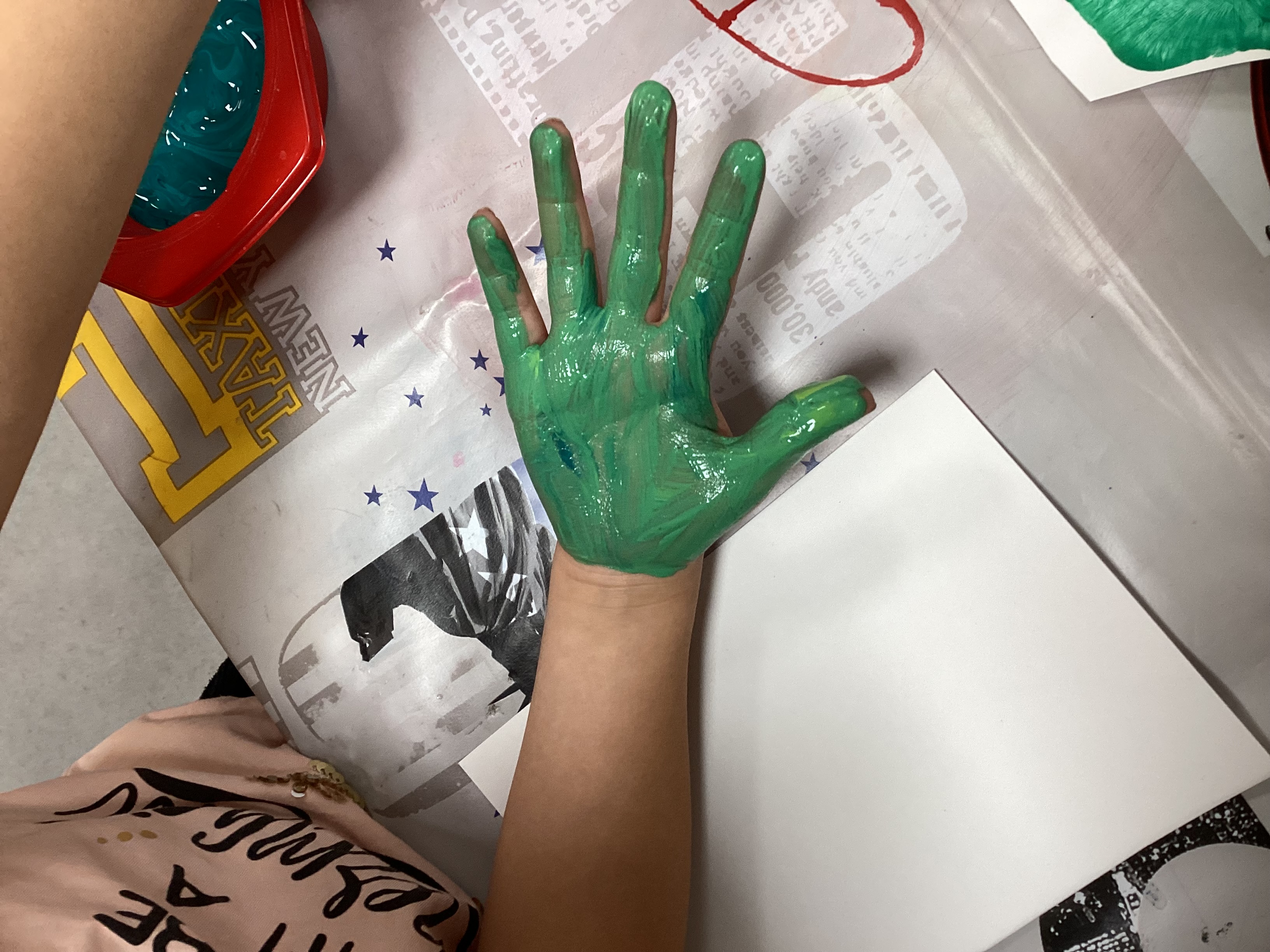 Painoimme käden kuvia ja väritimme väri muotoja