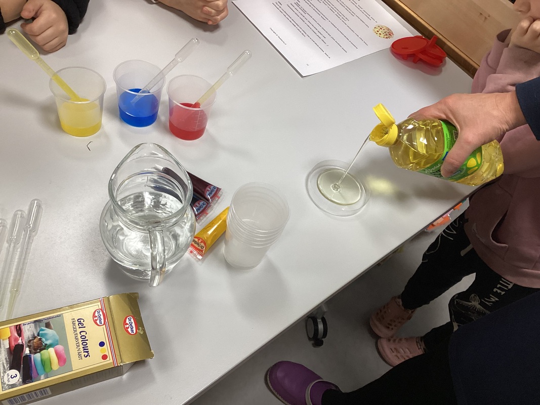 Toinen ryhmä teki tiedettä öljystä ja vedestä, petrimaljan ja pipettien avulla.