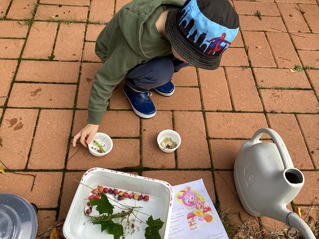 Keskiviikkona 27.8 koko poppoo lähti siemeniä etsimään luontotuvalle.Tiki-orava maiskuttelikin jo huuliaan ja haaveili herkullisista siemenistä.Havu-karhu taas halusi istuttaa siemeniä tutkiakseen mitä niistä tulee.