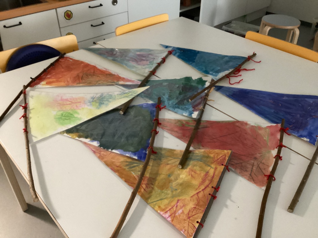 17.9 oli tuulinen päivä.Tutkimme tuulta ropelien avulla. Keräsimme syyslehtiä ja valmistimme niiden avulla liiduilla lapetekniikalla syysviirit.