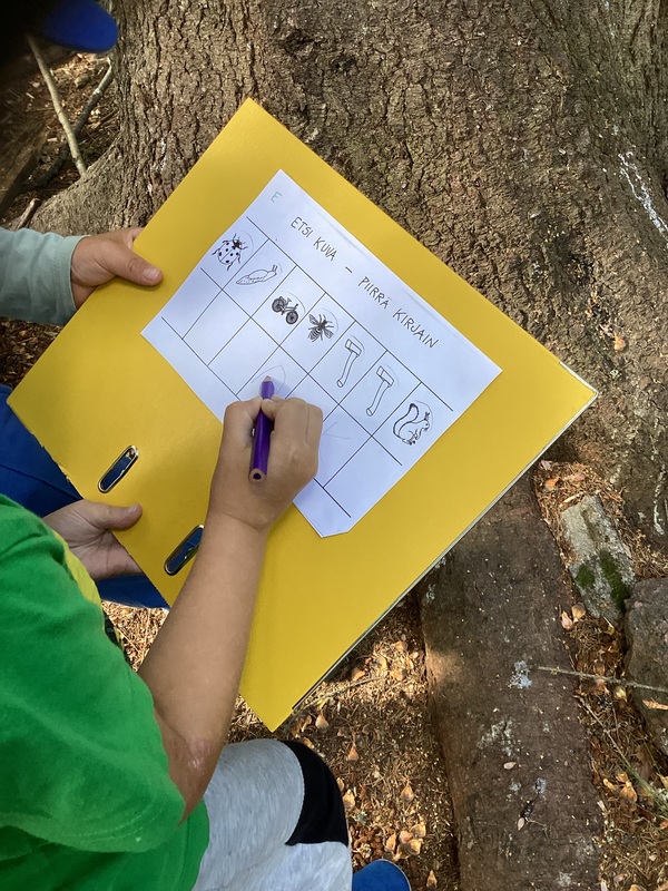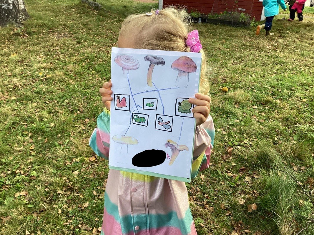 Ilma oli mahtava. Aurinko kurkisteli kun etsimme sienikortteja. Korteissa oli asukkaita ja tehtävässä selvitettiinkin kuka asui sienessä.